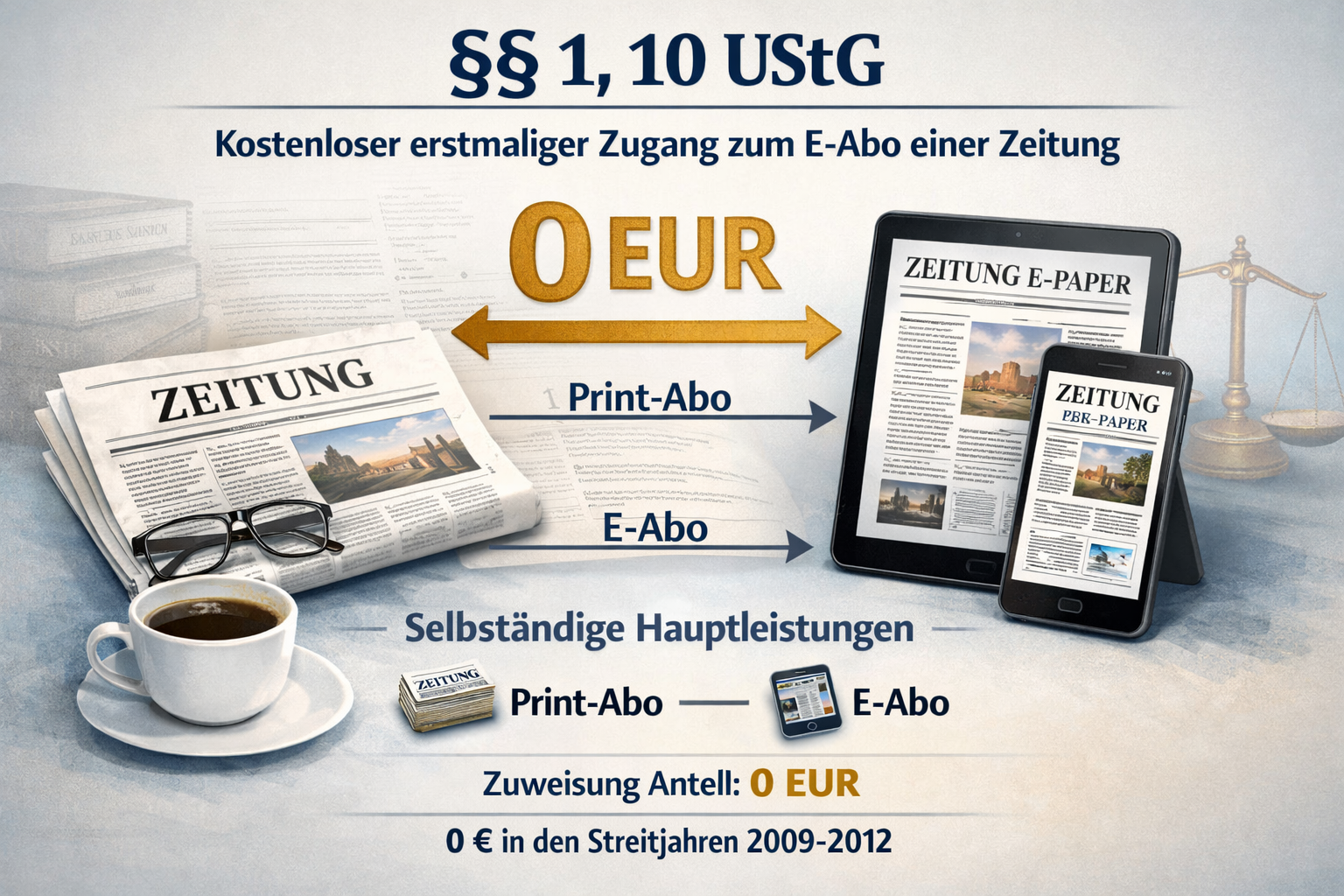 Bei der Lieferung einer Zeitung aus Papier (Print-Abo) und der Gewährung von Zugang zu einem E-Paper der Zeitung (E-Abo) handelt es sich um selbstständige Hauptleistungen, da sie nicht untrennbar sind, beide für den Kunden einen eigenständigen Zweck haben und das E-Paper nicht nur dazu dient, die Printausgabe der Zeitung unter optimalen Bedingungen zu lesen. In den Jahren 2009 bis 2012 war es noch gerechtfertigt, dem Zugang zum E-Abo einen Anteil am Gesamtentgelt von 0 EUR zuzuweisen, wenn und solange sich anlässlich der erstmaligen Gewährung des Zugangs der Gesamtpreis für das Abonnement nicht erhöht hatte.